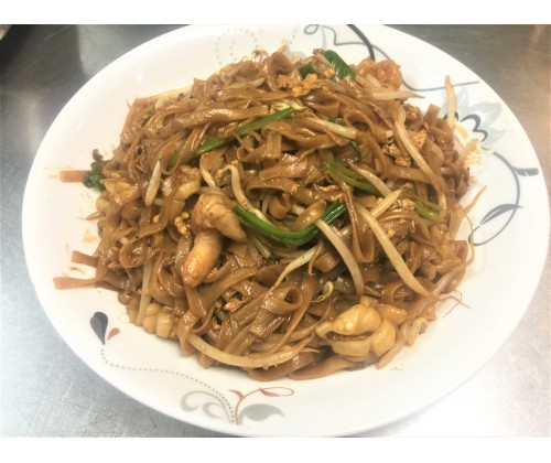 Malaysian famous stir fried noodle w. bean sprout, chives and egg in special soy sauce.