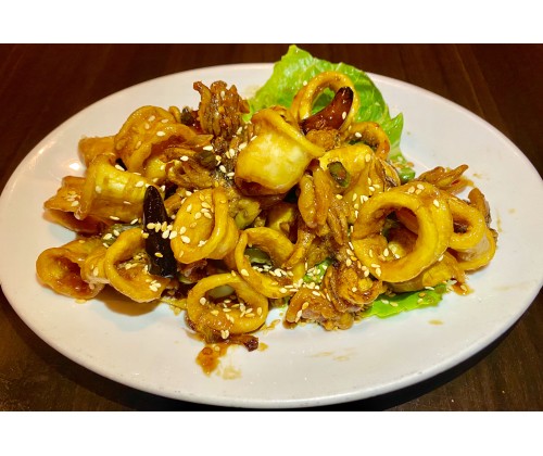 Authentic extra crispy baby squid w. tentacles in mild soy-honey sauce.