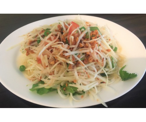 Green Papaya Salad Topped w. baby tomato, cilantro, crushed peanuts in homemade Lime sauce.