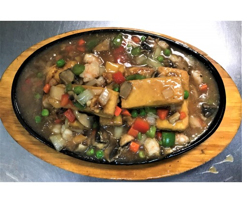 Lightly fried homemade tofu w. Salt fish bits, chopped shrimp & peas on a bed of eggs.