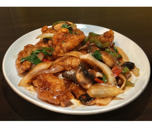 Stir-fry fish fillet w. bell peppers, onions, basil leaves, and mushrooms.