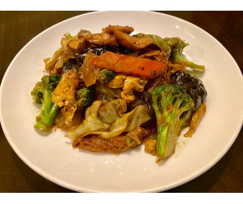 Assorted w. veg, tofu skin, glass noodle in light brown sauce.